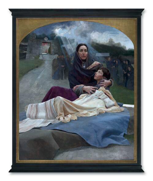 This painting captures one of the most profound moments of compassion in the Gospels, found only in Luke 7:11-17. As Jesus approached the town of Nain, he encountered a funeral procession carrying a young man to his burial. But this story belongs first to his mother, a widow burying her only son.